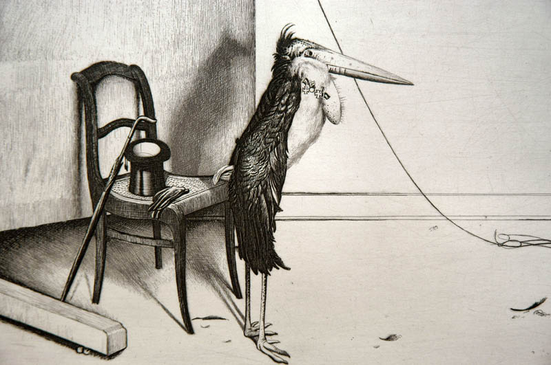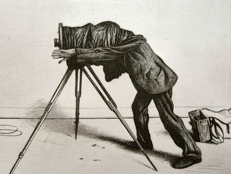 Eine verschlagen und auch ganz sparsam gemachte Drolligkeit geht nebenher: “ In voller Würde“. In einer Lichtbildner-Werkstatt eine Hintergrundtafel mit Stuhl davor, auf dem Zylinder, Handschuhe, Schirm lagern. Ein paar Nebensächlichkeiten an der Wand dahinter. Am Stuhl ein würdiger und sehr geschniegelter Marabu – ganz Würde – in seinem Vorleben sicher Konsistorialrat. Rechts der Lichtbildner– den Kopf unter der Decke seines Aufnahmekastens – die Linke weisend herausgestreckt: „Bitte, Herr Geheimrat– etwas mehr nach links!…“