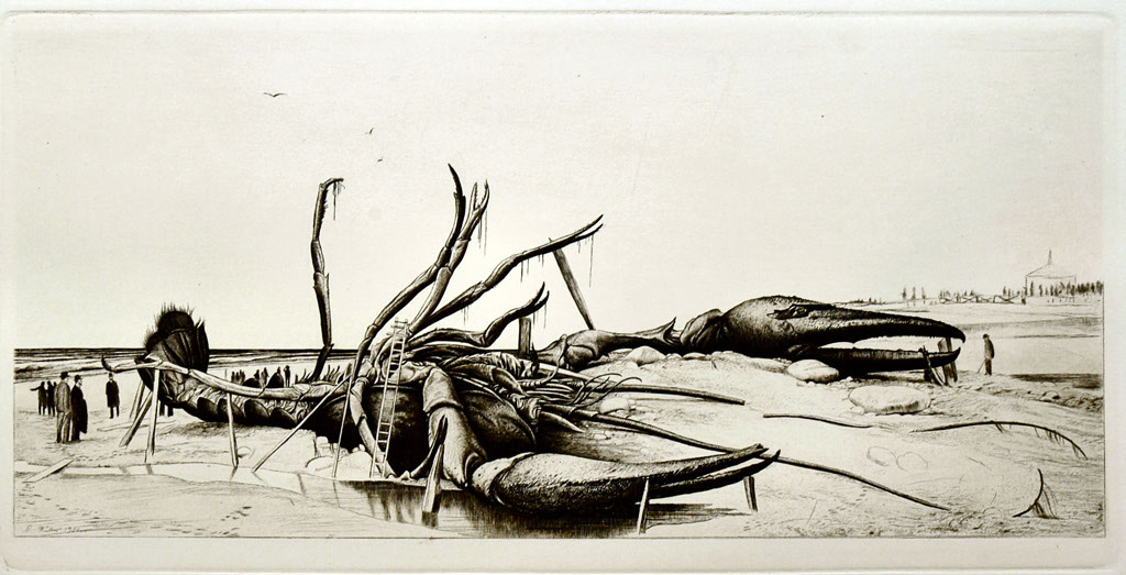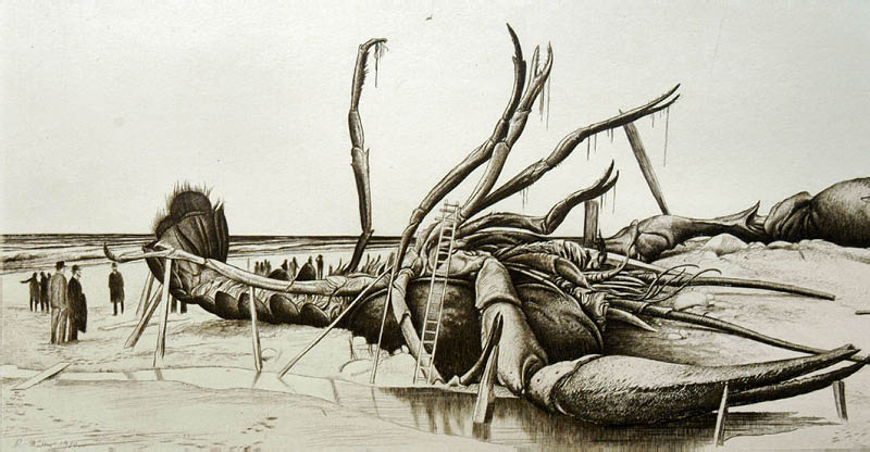 Sehr drollig wirken ein roh um das walfischgroße Krebstier gezogenes Geländer - an den Leib gelehnte Leitern - die Stützpfähle unter mehreren der Beine-schließlich auch die neugierige Menschenmenge, die staunend dies Mirakel umgibt.